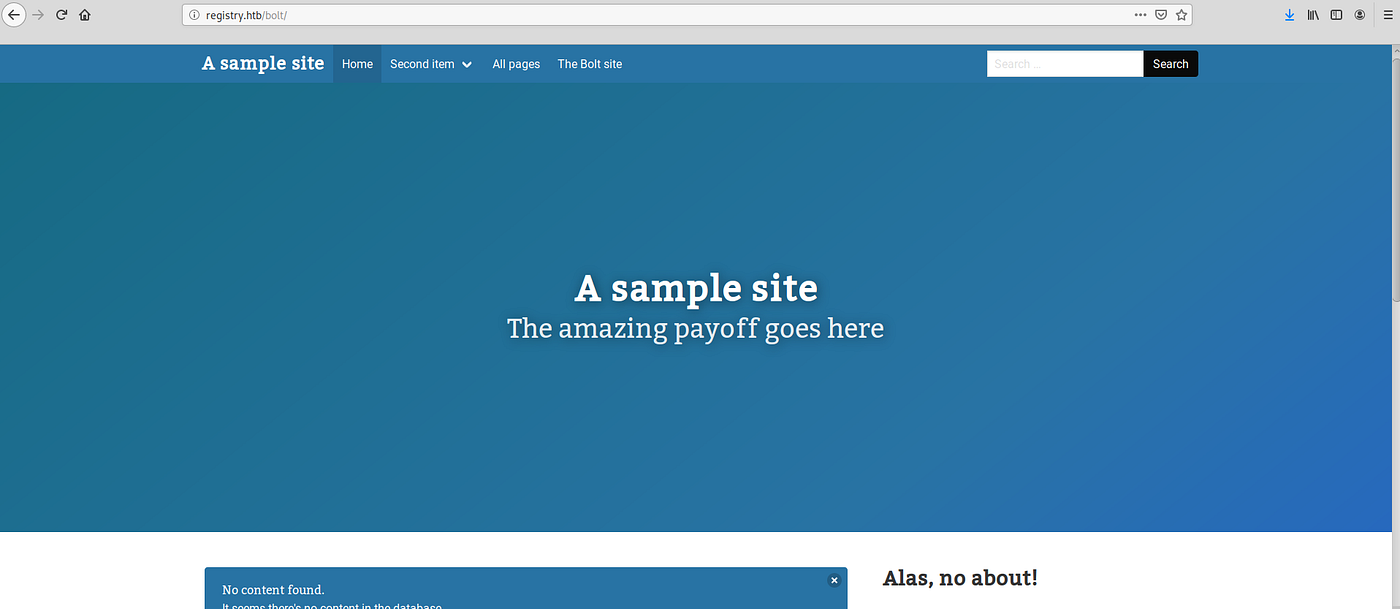 Navigating to registry.htb/bolt confirms that: