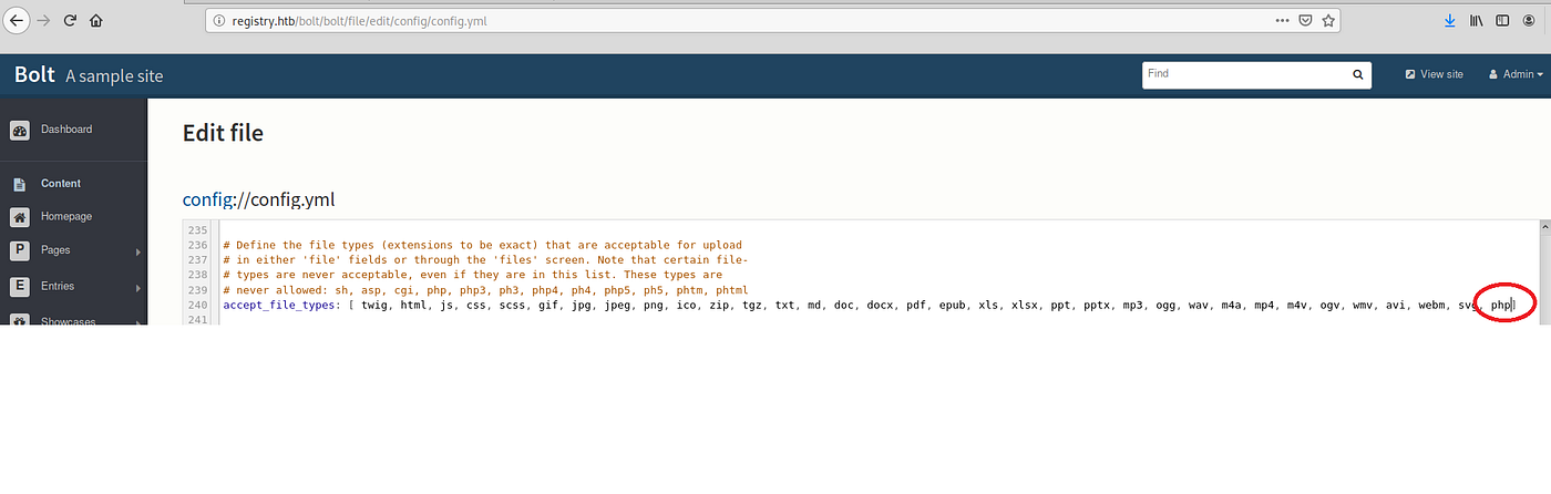 1|admin|$2y$10$e.ChUytg9SrL7AsboF2bX.wWKQ1LkS5Fi3/Z0yYD86.P5E9cpY7PK|bolt@registry.htb|2019-10-17 14:34:52|10.10.14.2|Admin|["files://shell.php"]|1||||0||["root","everyone"]